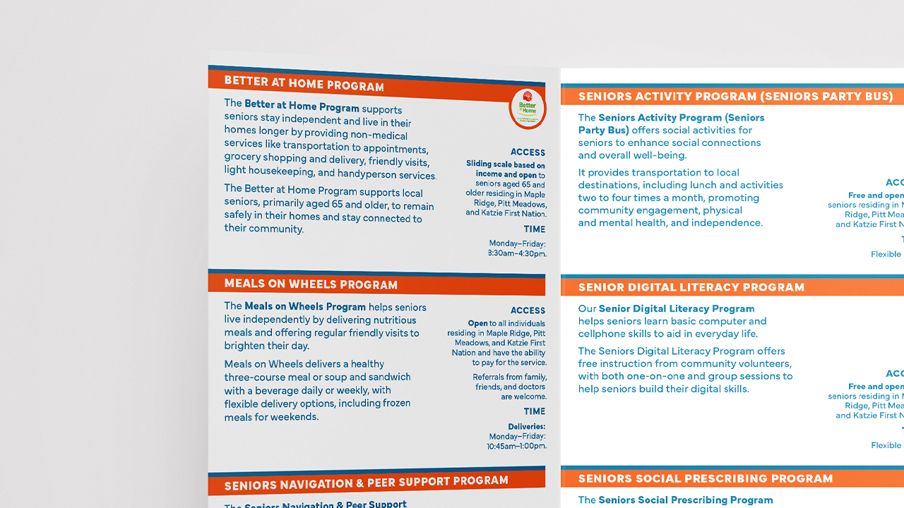 This approach utilizes brand colors, playful imagery, and a well-organized grid to enhance readability while maintaining a friendly, approachable aesthetic. These pamphlets are essential in how MRPM Community Services communicates the programs they offer to the entire Maple Ridge and Pitt Meadows community.